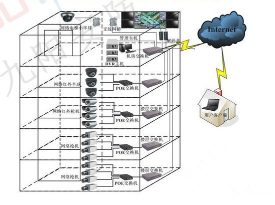 2.传输:各楼层摄像机通过网线和交换机级联(最多4次)进入弱电井楼层交换机,然后通过网线全部接入监控中心机房交换机。
